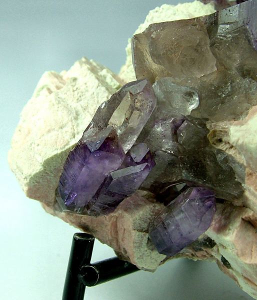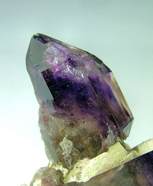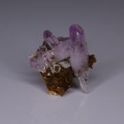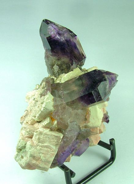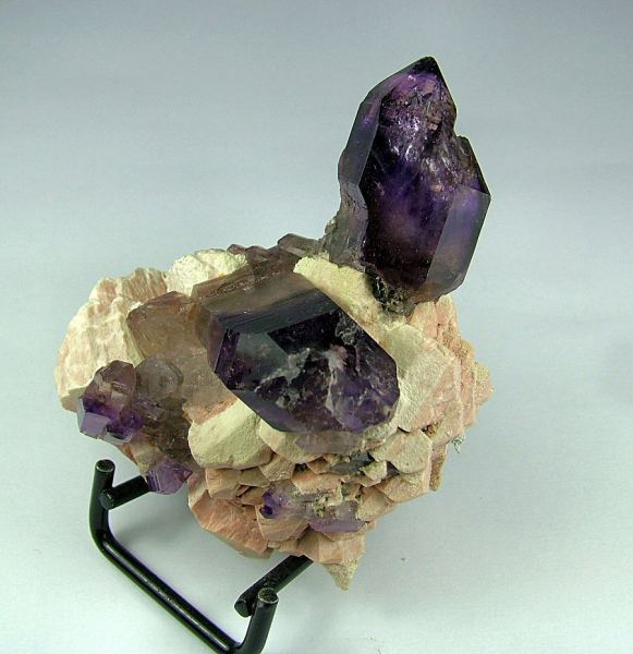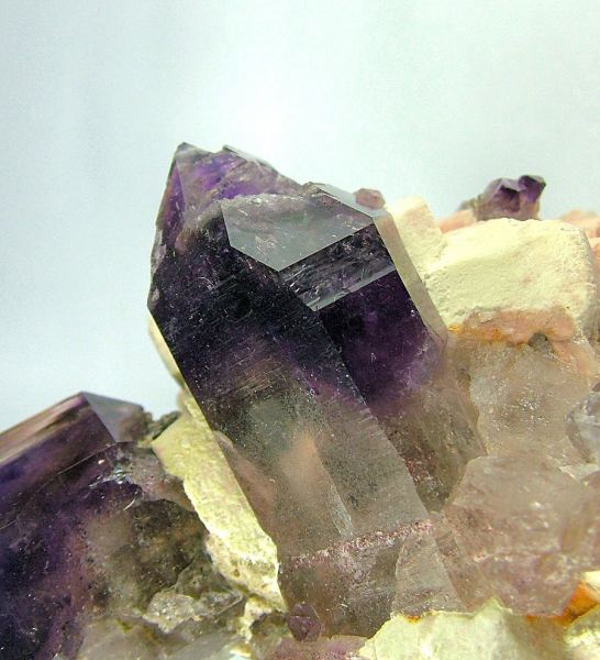 Group of Amethyst crystals, partially hoppered, with more intense color zones on the upper part, is implanted on Orthoclase's crystals with cream color, up to 12 mm. There's some little damage, not so visible to the naked eye. (Silvia Gallery)Data last checked on 5th Jan 2022 - specimen may no longer be available