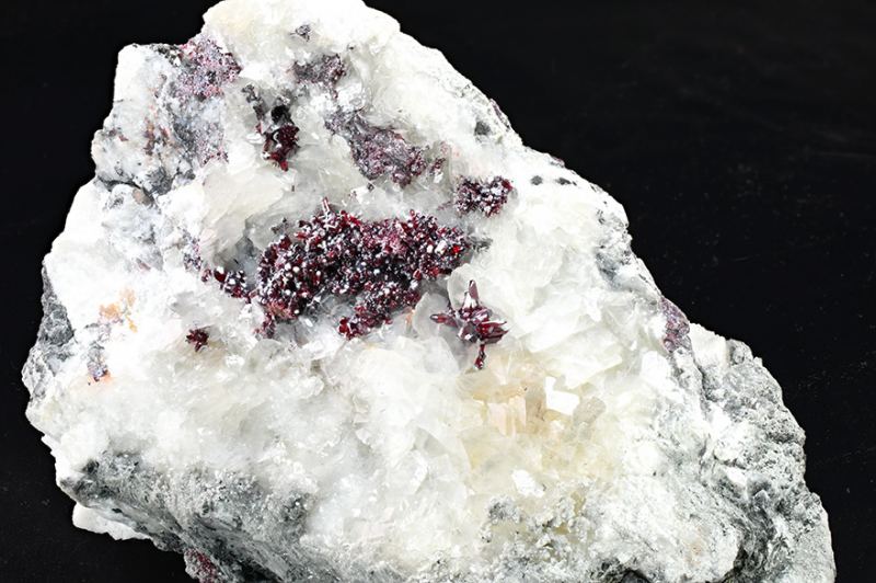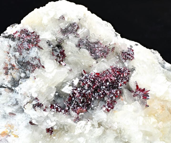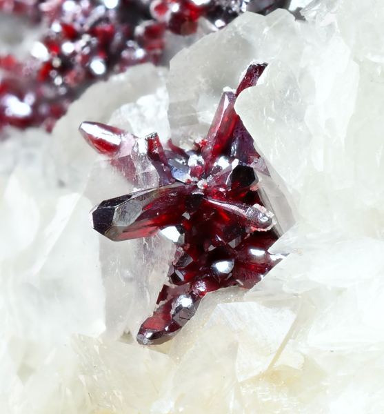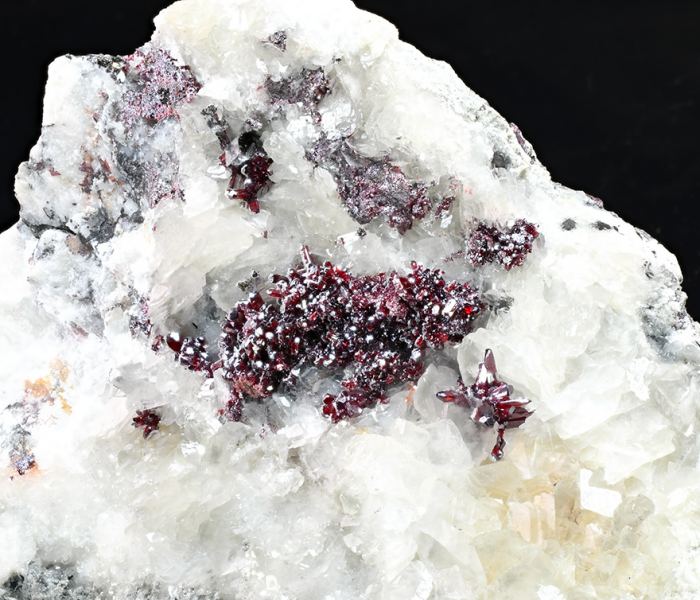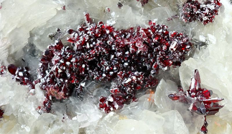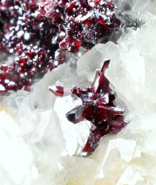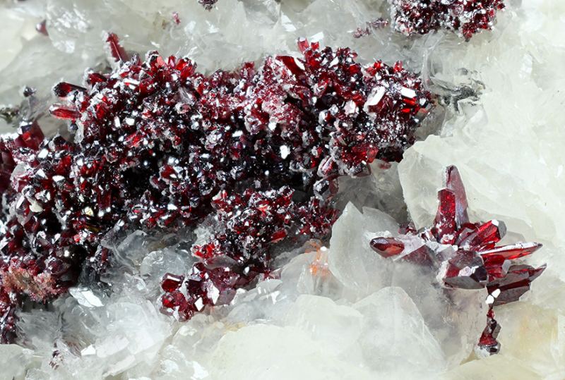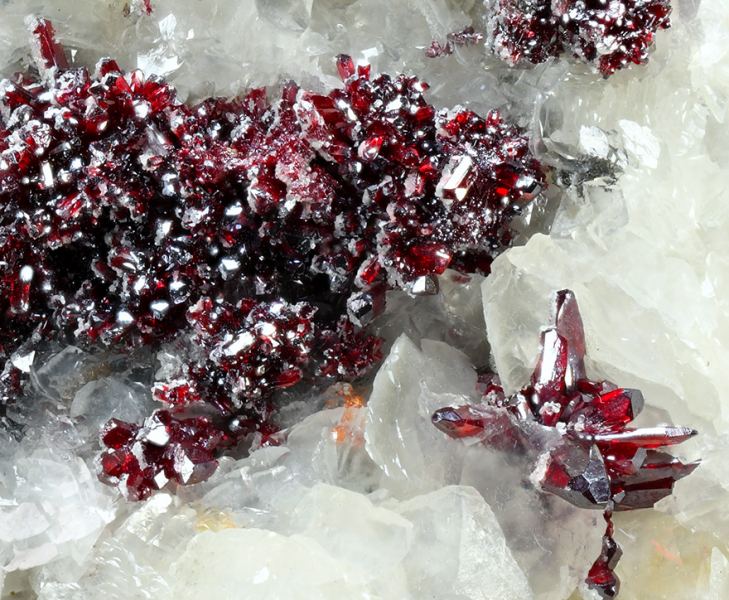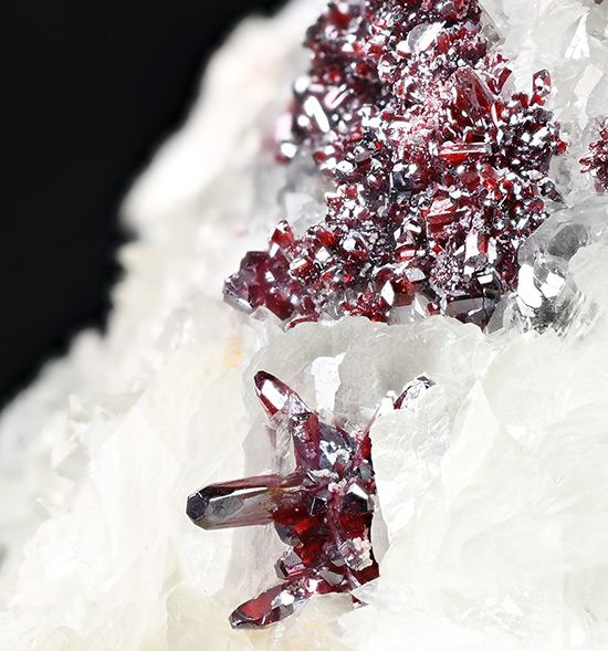 Groups of fine Proustite crystals with excellent prismatic terminations. The crystals are transparent with an extraordinary bright ruby-red color with mauve tones, sit on a Calcite matrix. This specimen, come from one of the first fin (Minservice GalleryData last checked on 5th Jan 2022 - specimen may no longer be available