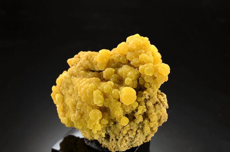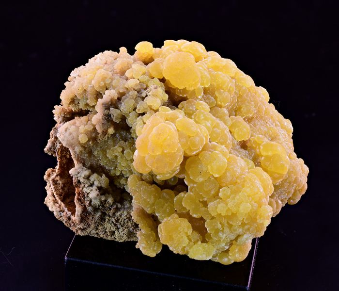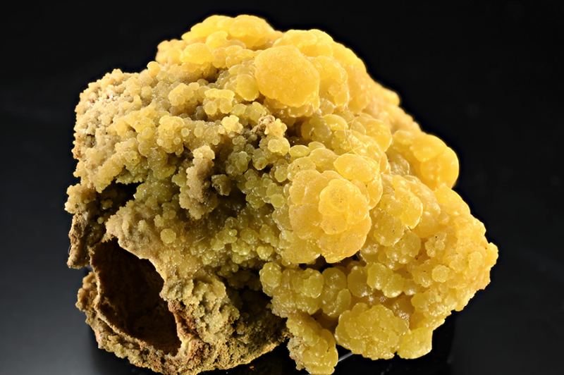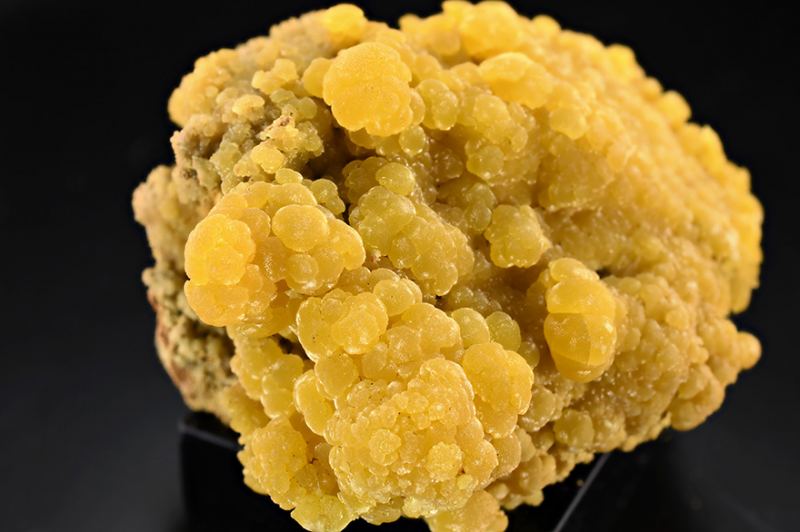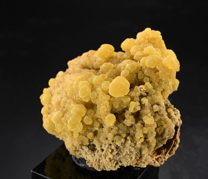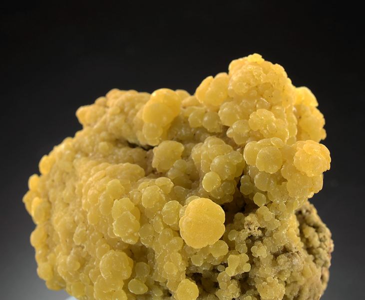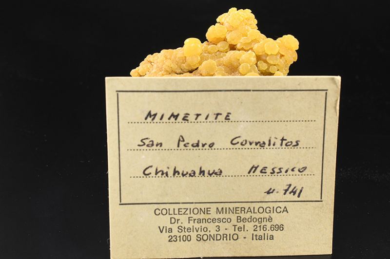 The specimen displays an aesthetic intergrown bubbly-botryoidal habit, forming spherical crystalline up to 7 mm diameter that cover the brown limonitic matrix. The Mimetite has a good yellowish color with a delightful satin lustre cre (Minservice GalleryData last checked on 5th Jan 2022 - specimen may no longer be available